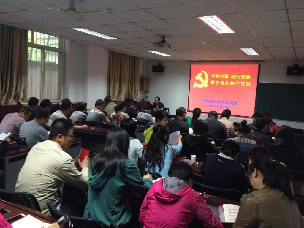 2016年5月25日,在电控学院雁塔校区会议室,党委书记杨勇同志结合自身学习情况,以“学好党章 践行党章 做合格的党员”为主题,为学院全体党员讲授了专题党课,党课从学习党章的重要意义、党章的主要精神和内容以及按照党章要求做合格的共产党员三个方面做了详细的解读和论述。他强调,全体党员要认真学好党章、积极践行党章,坚定理想信念、树立全心全意为人民服务的思想品德和高度自觉的组织纪律,做一名合格的共产党员。