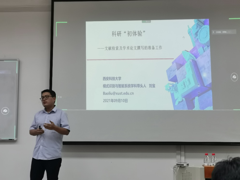 2021年9月10日,澳门网投十大信誉平台在3号教学楼408室组织召开第一次研究生入学教育系列活动。电控学院模式识别与智能系统学科带头人刘宝老师为全体2021级新生做了题为《科研“初体验”——文献检索及学术论文撰写的准备工作》的讲座。研究生辅导员李逸老师参加,学院副院长潘红光老师主持活动。
