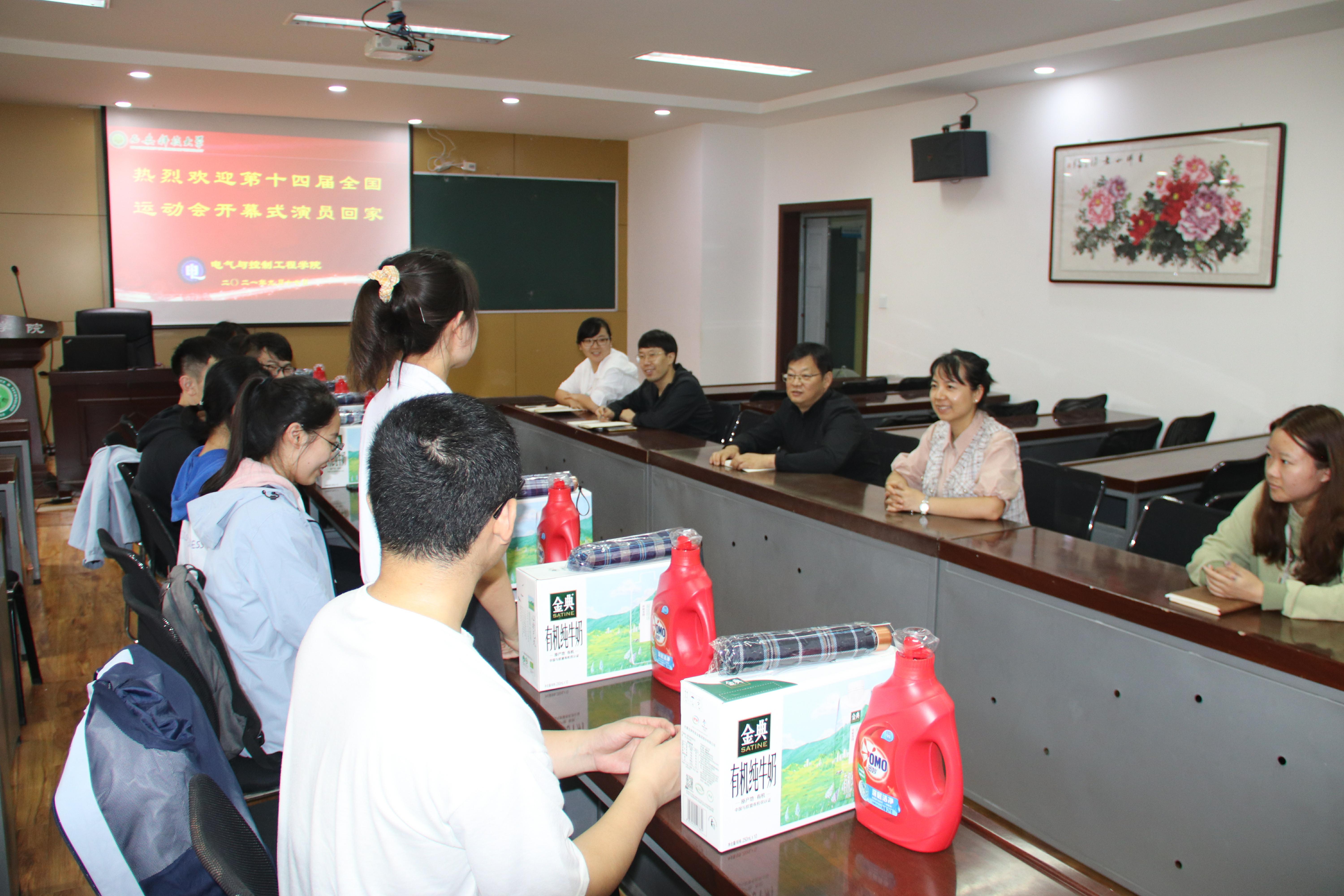 2021年9月17日中午13:00,电控学院于17-318会议室召开欢迎十四运开幕式演员回家座谈会,参加此次座谈会的有电控学院党委副书记丁铂、全体辅导员以及8名十四运开幕式演员。