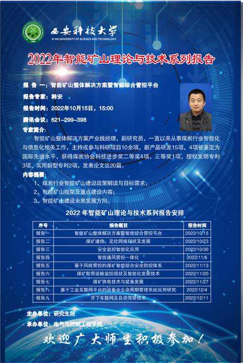 2022年10月15日电控学院通过线上的形式成功举办了“智能矿山理论与技术系列报告”第一讲。学院邀请了中煤科工集团常州研究院有限公司智能矿山整体解决方案产业线经理韩安为全校师生做了一场主题为“智能矿山整体解决方案暨智能综合管控平台”的行业前沿报告,韩经理开讲持续近3个小时,是一场的干货满满的科技报告。
