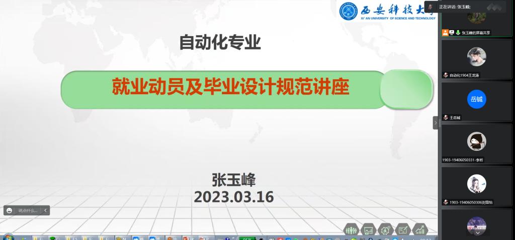 3月16日9:00,自动化系主任张玉峰老师召开了2023届自动化专业就业动员及毕业设计规范讲座。