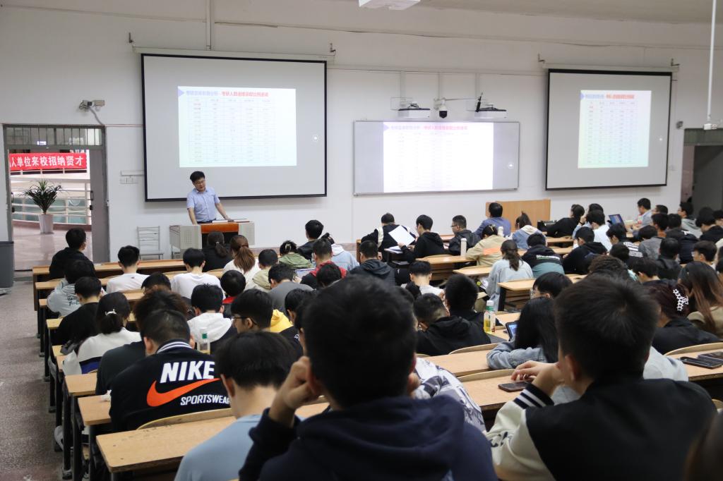 潘红光向同学们详细地分析了当前考研形势,并根据2023届毕业生的考研情况以及往年的研究生初试分数线与分数区间,对同学们的考研目标设立提出了切实可行的建议。随后介绍了考研的整体流程,为大家分析了近几年以来的考研报名人数、录取比例的变化趋势,初试复试上线的本校生源情况、高校毕业生毕业去向以及发展情况、研究生毕业就业情况,为大家分析了报考本校研究生的优势,和学校的考试范围,积极鼓励大家报考本校研究生。