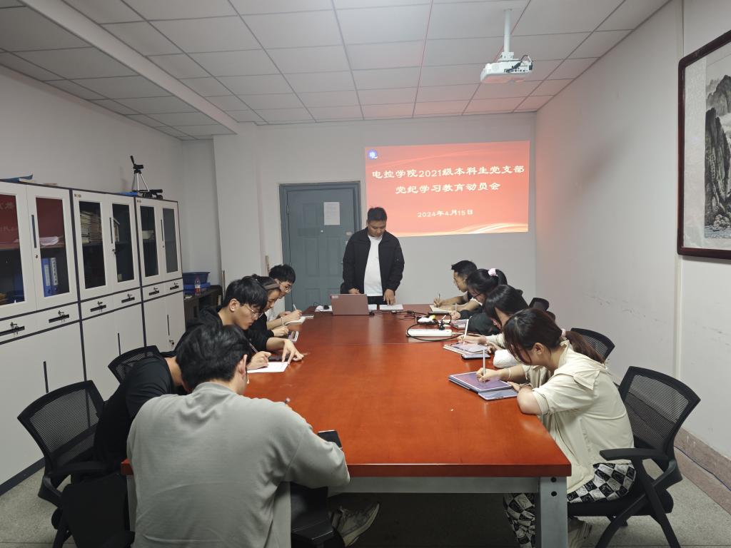 2024年4月15日,电控学院2021级本科生党支部在17教317召开党员大会,对党纪学习教育进行动员部署,会议由党支部书记王永主持,支部全体党员参加。