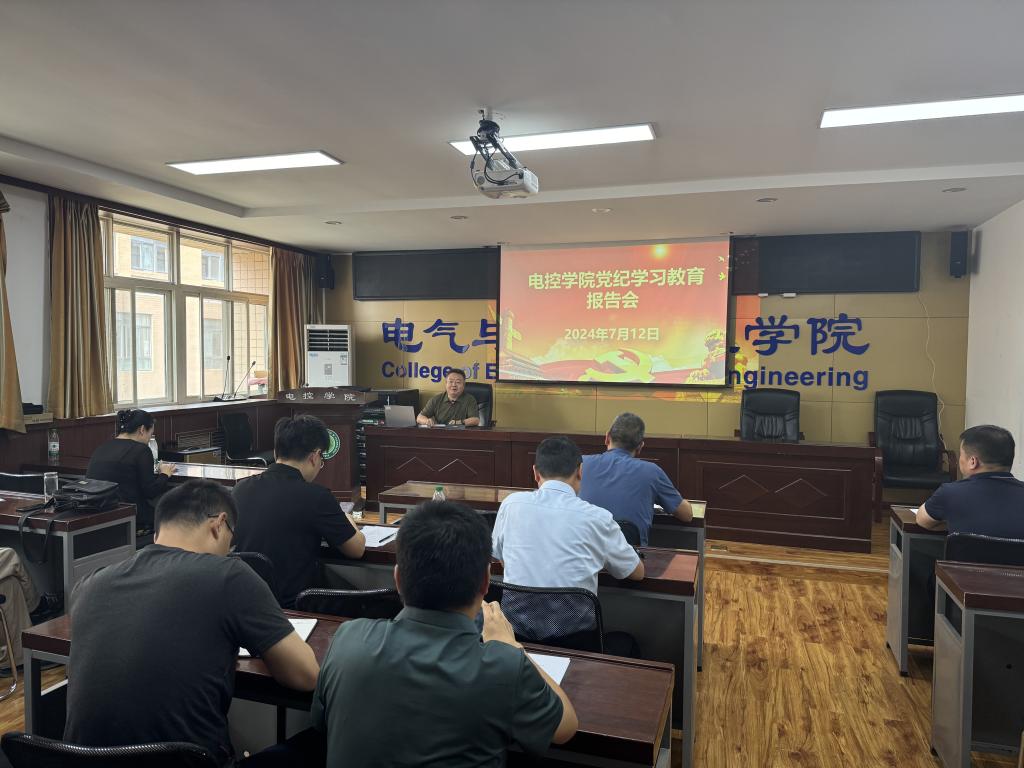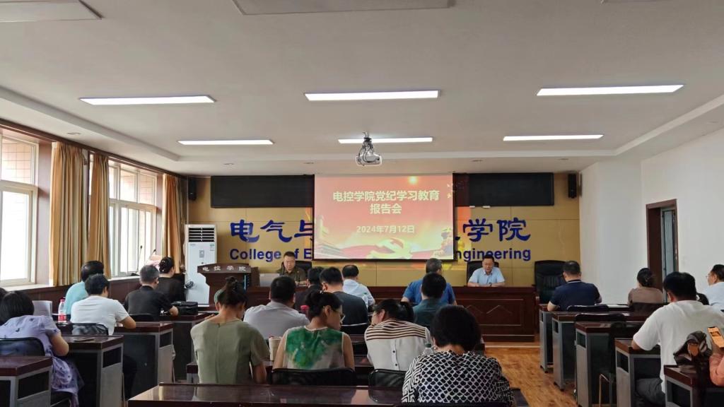 为持续深入开展党纪学习教育,7月12日下午,电控学院邀请省纪委监委驻校纪检监察组纪检监察室主任田俊峰做党纪学习教育警示教育报告。电控学院领导班子、全体教职工参会,报告会由党委书记杨华主持。